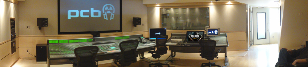 PCB Studio facilities offer: Talent Direction, Dialog production, Casting and Signatory services, Motion Capture / Performance Direction, Facial Capture, Sound Design, Original Music, Script writing, Green Screen services, ADR, Foley, Location Sound Recording, and Cinematic Sound Design for Console, Motion Picture, Internet, iPhone, iPad, Television, Animation, Motion Comics, and Graphic Novel Development.